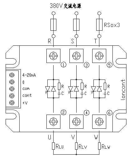 2、 三相交流電路的進(jìn)線R、S、T無相序要求,導(dǎo)線粗細(xì)按實際使用電流選擇。U、V、W輸出端可接380Vac的Y形電加熱負(fù)載(N線不接)。