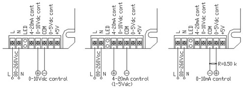 ④、4-20mA控制方式:按圖示,可接受溫控表等的4-20mA模擬信號,模塊內(nèi)部4-20mA端相對com端的輸入阻抗為250Ω。采用此方式時‘0-10Vdc’端與+5V端和cont端懸空。