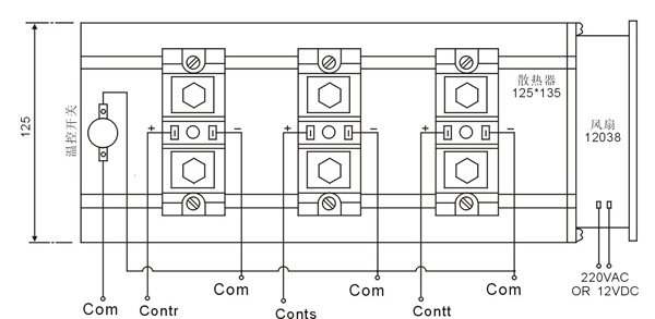 觸發(fā)器的四個com在模塊內(nèi)部為直通相連,為弱電“地”,在自動控制方式時可與外電路控制的直流“地”相連。三只隨機(jī)型固態(tài)繼電器的控制負(fù)極分別與觸發(fā)器com連接,也可接在一起,再連接到75℃常閉型溫控開關(guān)的一端,溫控開關(guān)另一端與觸發(fā)器任一com公共端相連,當(dāng)散熱器溫度過高時,可停止三只隨機(jī)型固態(tài)繼電器的輸出,達(dá)到超溫保護(hù)。