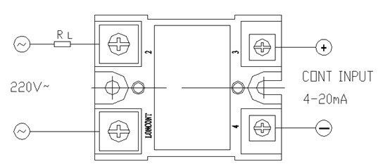 調(diào)壓器內(nèi)部①②端為可控硅電路,分為雙向可控硅普通型、單相可控硅反并增強(qiáng)型和單相可控硅半波型。其中半波型只對(duì)交流電壓的正半周調(diào)壓(模塊內(nèi)部單向可控硅的陽(yáng)極接①端,陰極接②端)。③④端為4-20mA控制輸入,③端接正極,④端接負(fù)極,可以與溫控表或PLC等的4-20mA輸出控制端口匹配。調(diào)壓器輸出電壓隨著控制信號(hào)的強(qiáng)弱而線性變化。
