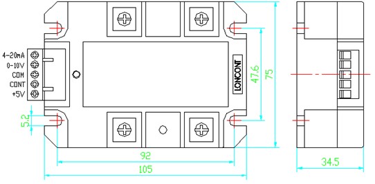 ②、0-5Vdc控制方式:按圖示,可接受0-5Vdc模擬信號(hào),控制輸入正極接cont端、負(fù)極接com端,模塊內(nèi)部cont端相對(duì)com端的輸入阻抗大于30KΩ。當(dāng)控制端cont從0-5Vdc改變時(shí),直流負(fù)載上的電壓從0伏到最大值線性可調(diào),其中cont在0-0.7Vdc左右時(shí)為全關(guān)閉區(qū)域,可靠關(guān)斷整個(gè)電路的輸出;cont在0.7Vdc-4.3Vdc左右為可調(diào)區(qū)域,即隨著控制電壓的增大,移相角α從180°到0°線性減小,導(dǎo)通角增大,負(fù)載上的電壓從0伏增大到最大值;cont在4.3Vdc-5Vdc左右時(shí)為全開通區(qū)域,負(fù)載上的電壓為最大值(相當(dāng)于電網(wǎng)電壓直接橋式整流)。