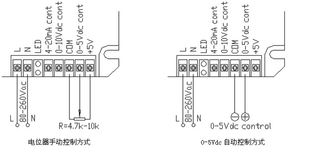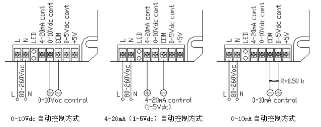 ③、0-10Vdc控制方式:按圖示,可接受0-10Vdc模擬信號,模塊內(nèi)部0-10Vdc端相對com端的輸入阻抗大于15KΩ。