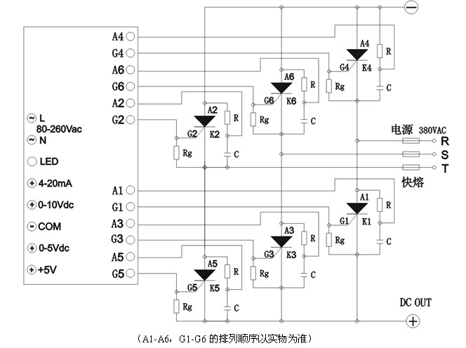 4、三相觸發(fā)器的觸發(fā)端(如A1、G1,……,A6、G6)為單寬脈沖強(qiáng)觸發(fā)方式,可以觸發(fā)額定電流1500A以內(nèi)的任何單向可控硅。強(qiáng)觸發(fā)方式的連線為A1、G1對應(yīng) KPl的陽極和門極,而不是變壓器驅(qū)動(dòng)方式用的陰極和門極。