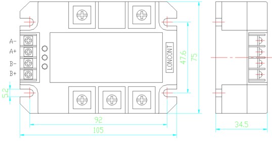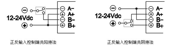 5、輸入控制電壓為12-24Vdc,共陽或共陰可任意接線。控制線共陽連接時,A—、B—端低電平有效,當A—、B—端同時為低電平時模塊自動關閉。共陰連接時,A+、B+端高電平有效,當A+、B+端同時為高電平時模塊自動關閉。其他控制電壓也可定制。